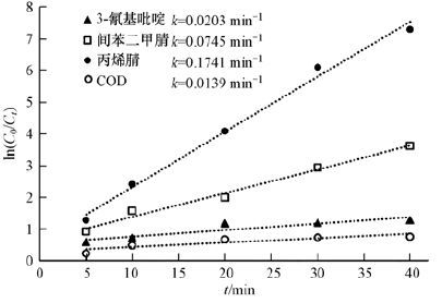 式中,C0為Fenton反應(yīng)前污染物初始濃度(mg·L-1),t為反應(yīng)時間(min),Ct為反應(yīng)時間t后的污染物濃度(mg·L-1),k為反應(yīng)速率常數(shù)(min-1).