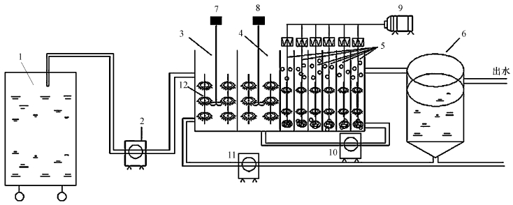 圖 1 A2/O工藝流程 (1.進水箱;2.蠕動泵;3.厭氧區;4.缺氧區;5.好氧區;6.二沉池;7.攪拌器;8.攪拌器;9.鼓風機;10混合液回流;11.污泥回流;12.填料)