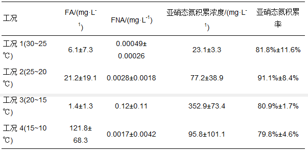 FA和FNA濃度分別由公式(1) 和公式(2) 計算, 亞硝態(tài)氮積累率由公式(3) 計算, 各工況下的FA、FNA濃度以及亞硝態(tài)氮積累情況如表 2所示.