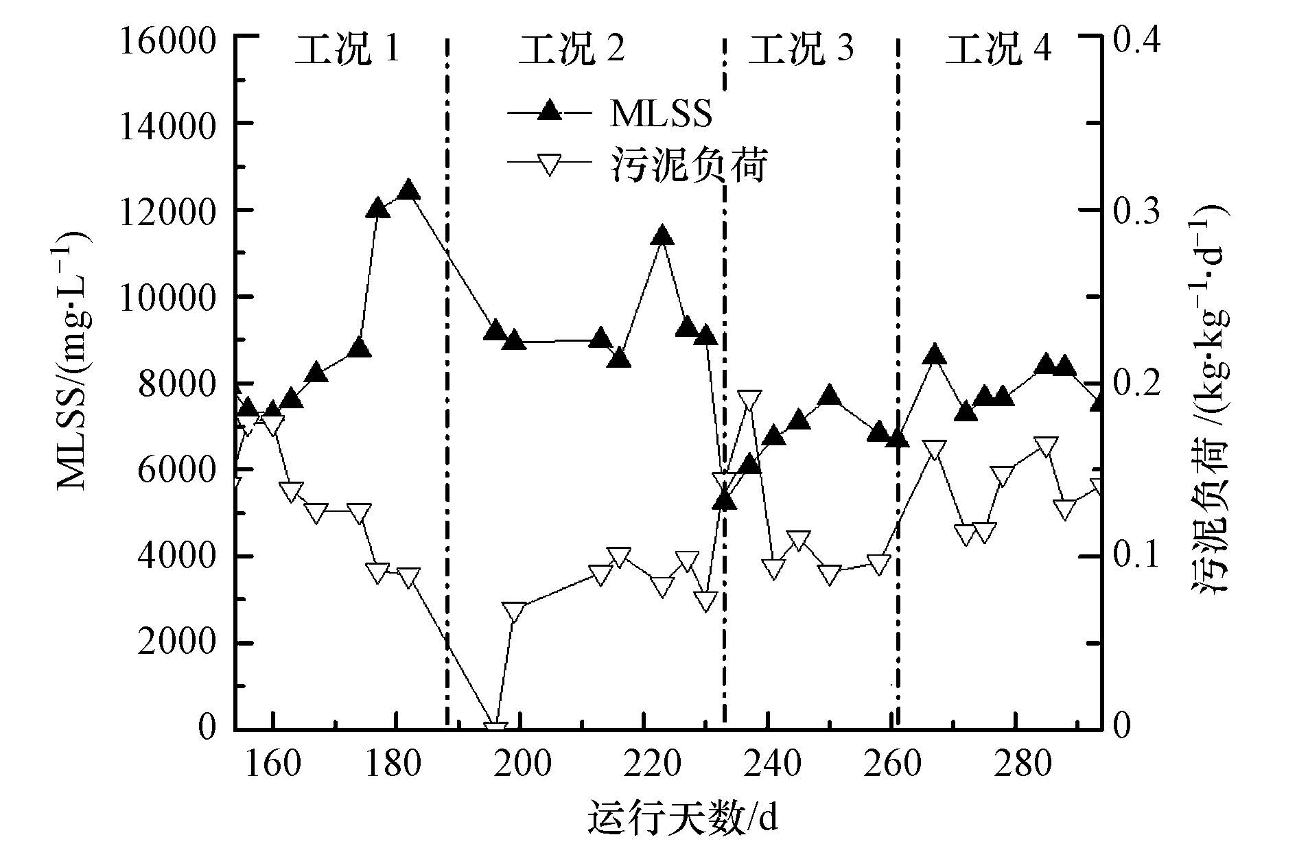 圖 1 IASBR中有機(jī)污泥負(fù)荷和污泥濃度變化