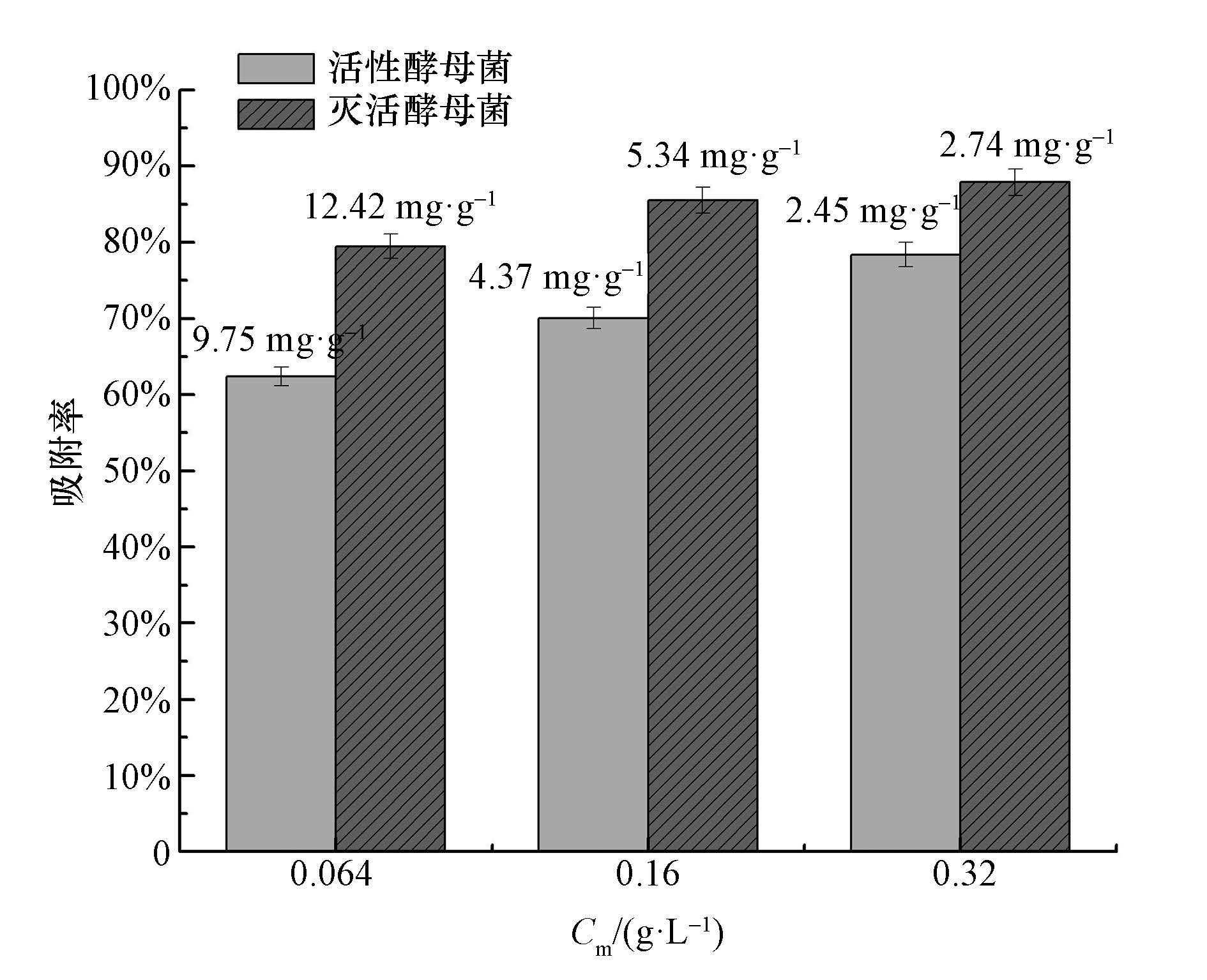 圖 3 不同活性菌體投加量對吸附鈾的影響(pH=5.0±0.1,t=4 h,C0=1mg ·L-1,T=26 ℃;柱狀圖上方數據為吸附量)