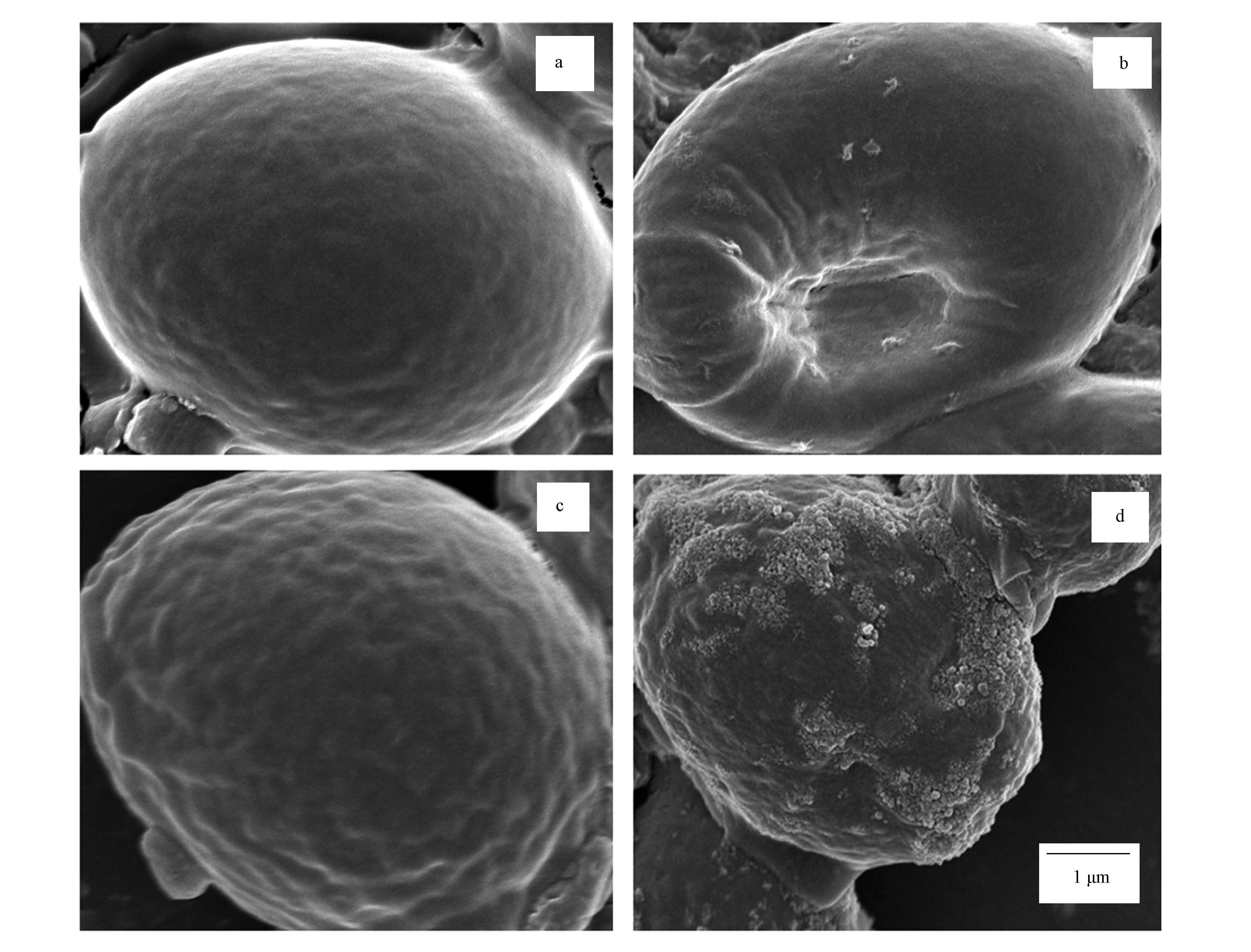圖 6 吸附前后活性與滅活酵母菌掃描電鏡圖(a.吸附前活性酵母菌,b.吸附后活性酵母菌,c.吸附前滅活酵母菌,d.吸附后滅活酵母菌;×15000;pH=5.0±0.1,t=2 h,C0=100 mg·L-1,Cm=1.60 g·L-1,T=30 ℃)