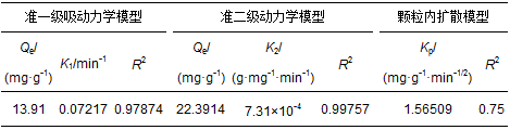 式中, Qt為t時刻的吸附量(mg·g-1), t為吸附時間(min), K1為擬一級吸附速率常數(min-1), K2為擬二級吸附速率常數(g·mg-1·min-1), Kp為顆粒內擴散速率常數(mg·g-1·min-1/2).