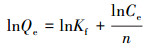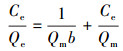 在pH為4, 投加量為5 g·L-1時, 復合改性膨潤土對活性紅X-3B的吸附等溫線如圖 5所示.分別利用Langmuir方程(2)和Freundlich方程(3)對吸附等溫數據進行線性擬合, 結果見圖 6、表 1.