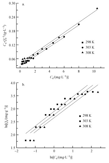 式中, Ce為平衡濃度(mg·L-1), Qe為平衡吸附量(mg·g-1), Qm為飽和吸附量(mg·g-1), b為Langmuir吸附常數(L·mg-1), Kf為Freundlich方程常數, 1/n反映吸附強度的大小.