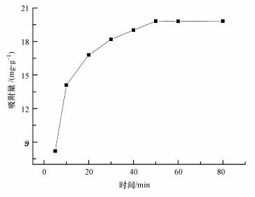 在pH為3, 投加量為5 g·L-1, 溫度為298 K的條件下, 吸附動力學曲線如圖 7所示.可以看出, 隨著時間的增加, 復合改性膨潤土對活性紅X-3B的吸附量增大, 在吸附時間為50 min時, 吸附達到平衡.