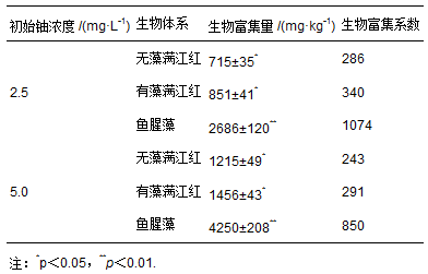 表 1 無藻滿江紅、有藻滿江紅和魚腥藻對水中鈾的富集量及富集系數(shù)