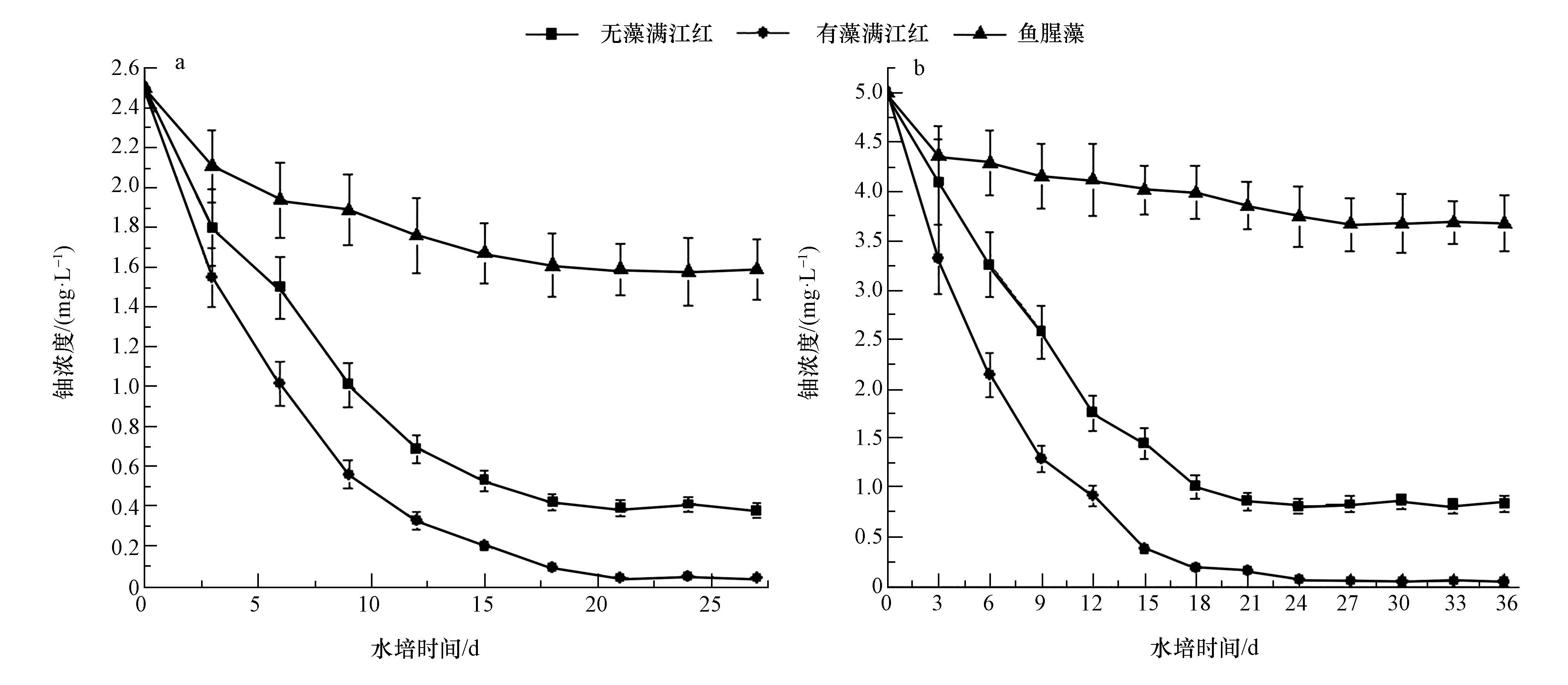 圖 1 在無藻滿江紅、有藻滿江紅和魚腥藻作用下水中鈾濃度的變化(a.2.5 mg·L-1,b.5.0 mg·L-1)