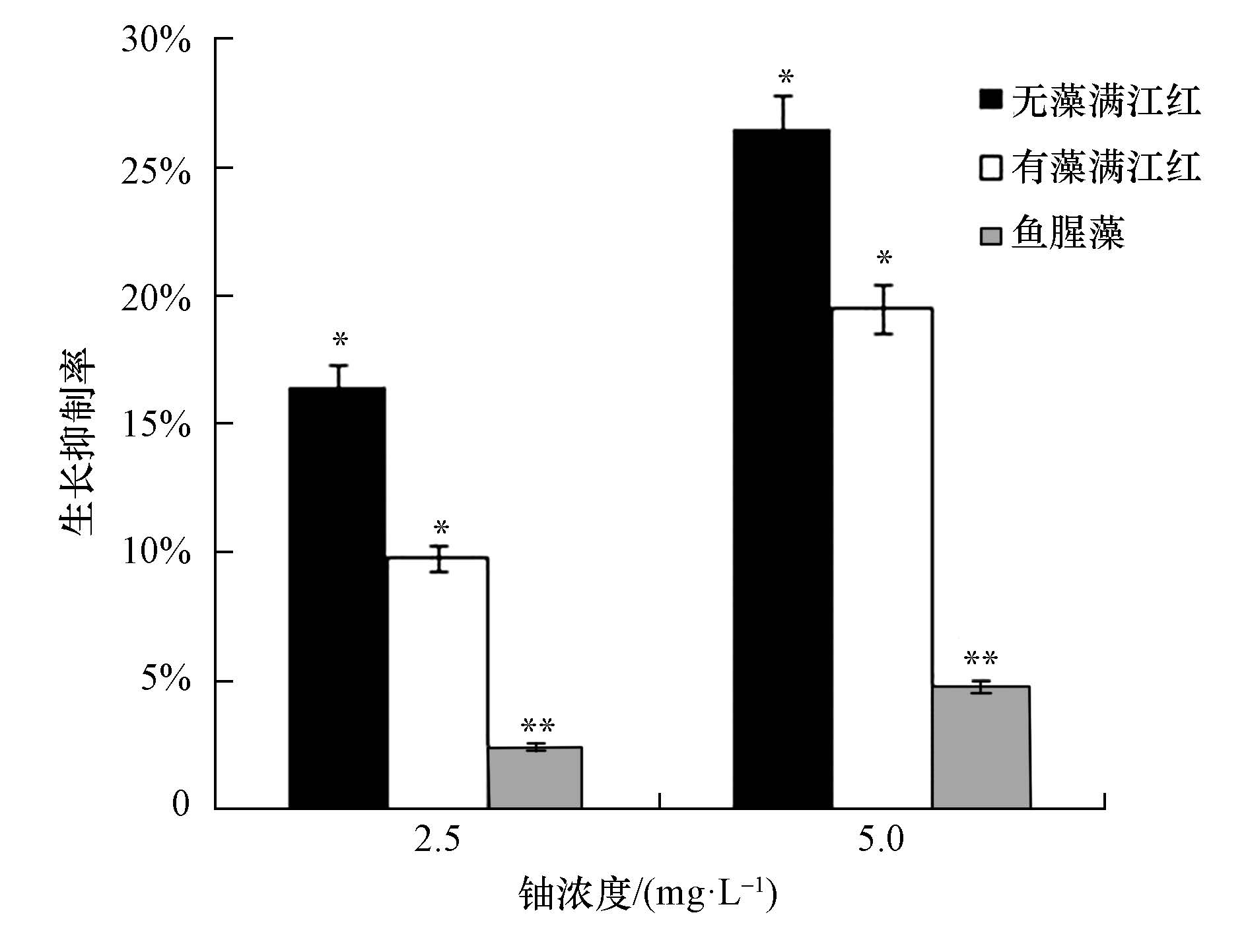 圖 2 無藻滿江紅、有藻滿江紅和魚腥藻在鈾脅迫下的生長抑制率(*p<0.05,**p<0.01)