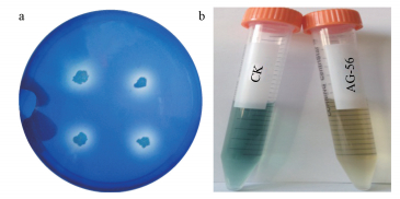 圖 1 菌株AG-56對苯胺藍的脫色作用(a.苯胺藍平板, b.苯胺藍液體培養3 d后離心上清液)