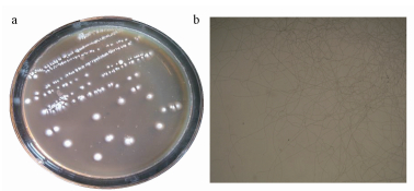 圖 2 AG-56培養平板(a, 3 d)與顯微的(b, 400倍)形態