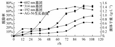 因此, 菌株對苯胺藍特征基團的降解能力順序為602 nm基團>192 nm基團>314 nm基團, 并由圖可推測AG-56對602 nm、314 nm處基團的降解主要是依靠菌株進入穩定期后產酶的作用, 對192 nm處基團的脫除存在物理吸附和產酶降解兩種主要作用(Si et al., 2013), 且以菌體吸附作用為主.