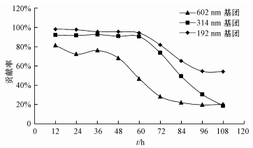 鏈霉菌AG-56對苯胺藍3個特征波長基團的降解率如圖 6所示.從圖 6中菌株生長曲線與降解曲線的關系可以看出, 菌株對苯胺藍的降解主要發生在菌種進入穩定期后.即60 h前主要是菌種的生長及誘導產酶期, 并伴隨菌株對苯胺藍的吸附作用(圖 7), 這與真菌對染料的降解相似(Si et al., 2013).對于602、314 nm處基團, 菌體吸附發揮作用主要在前期, 60 h以后, 菌體吸附的貢獻率直線下降;且從理論上講, 菌體對苯胺藍的吸附是有限的, 而后期主要依靠菌體產酶對苯胺藍的降解, 602 nm處基團降解96 h, 降解率達到70%以上, 菌株對602 nm處基團的降解是苯胺藍脫色的主要原因.對314 nm處基團的降解主要發生在72 h后, 并且在監測時間內, 最大降解率只達到了32%, 而菌體吸附作用也只提供了10%以下的去除率.對苯胺藍192 nm處基團的降解自菌體生長開始就處于一種穩步上升的趨勢, 說明菌體對此波長處基團的吸附作用最大, 雖然72 h后, 降解效率稍有提高, 但從圖 7中可以明顯看出, 菌體的吸附作用仍然占有80%以上的去除貢獻率.當最大降解率達到48%時, 菌體吸附仍然是192 nm處基團去除的主要作用.
