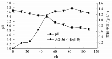 從圖 8可以看出, 在AG-56對苯胺藍的脫色過程中, pH隨著菌體的生長逐漸降低, 特別是60 h后, 菌體進入穩定期, 苯胺藍進入了快速降解期, pH也下降較快.這說明菌體進入穩定期后, 可能開始分泌能夠降解苯胺藍的酸性酶類, 隨著酶分泌的越多, 使得pH呈現下降趨勢.