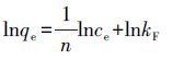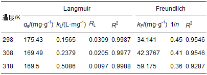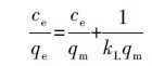 式中,qm為最大吸附量(mg·g-1),ce是吸附平衡時溶液中吸附質的剩余濃度(mg·L-1),qe是吸附平衡時吸附劑對吸附質的吸附量(mg·g-1),kL是與吸附性能有關的平衡常數(L·mg-1).以ce/qe對ce作直線,由該直線的斜率和截距可得qm與kL的值.在這里可定義一個無量綱分離系數RL: