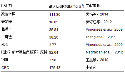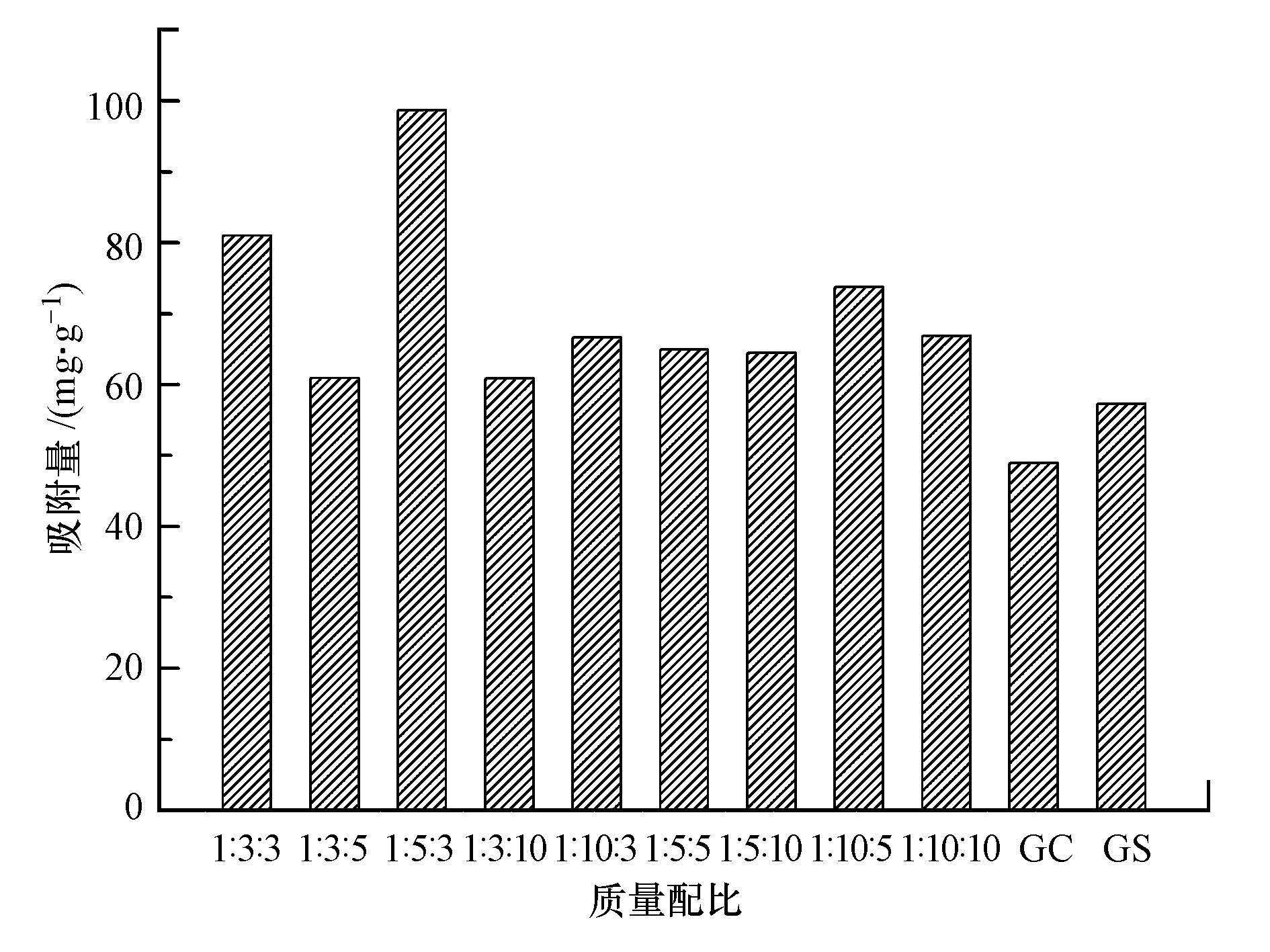 按照2.2.2 節的制備方法制備了GO、EDTA-2Na和CS質量比分別為1∶3∶3、1∶3∶5、1∶5∶3、1∶3∶10、1∶10∶3、1∶5∶5、1∶5∶10、1∶10∶5、1∶10∶10的GEC,在同一條件下對所有材料的吸附性能進行研究,結果如圖 5所示.從圖中可以看出,GEC的吸附量普遍比GC和CS高,說明改性是成功的,且取得了一定的效果.統一實驗條件下GC的吸附量比CS略低,這是由于GO分子中的羧基和CS分子中的氨基鍵合,從而使吸附官能團的數量減少而導致吸附量降低.而EDTA-2Na的加入帶入了氨基和羧基,從而使吸附位點增多,改善了前面出現的問題,從而使吸附量大大提高.對比不同質量配比的GEC吸附量可得出,當GO、EDTA-2Na和CS質量比為1∶5∶3時,GEC吸附量最高,且遠遠超過其他材料,由此可知,制備改性氧化石墨烯/殼聚糖功能材料時三者含量最佳配比選擇為1∶5∶3.