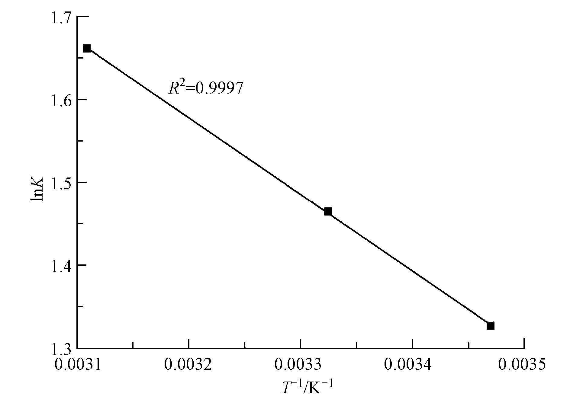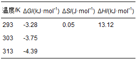 式中,c0(mg·L-1)是溶液中溶質的最大初始濃度.根據RL的值可將吸附等溫線分為非優惠吸附(RL>1)、線性吸附(RL=1)、優惠吸附(0 Freundlich模型適用于發生在不均一吸附劑表面的非理想吸附,屬于經驗方程式,其線性形式為: 式中,1/n為無量綱的系數,該系數與吸附強度有關;kF為Freundlich吸附平衡常數.以lnqe對lnce作直線,通過該直線的斜率和截距可得1/n和kF的值. 圖 10 GEC吸附剛果紅的Langmuir吸附等溫線(a)和Freundlich等溫線(b)擬合 應用上述兩種吸附等溫線對實驗數據進行擬合,所得結果如圖 10和表 2所示.由表 2的擬合參數可知,Langmuir 吸附等溫模型能更好地描述GEC對CR的吸附過程.通過Langmuir吸附等溫方程式擬合可知,GEC在不同溫度條件下對CR的最大吸附容量分別為175.43 mg·g-1(298 K)、169.4 mg·g-1(308 K)和169.50 mg·g-1(318 K).此外,參數RL都符合0 表 2 GEC吸附CR的吸附等溫線參數 表 3中列出了本研究和近幾年已經報道過的吸附劑對剛果紅的最大吸附量.從表中可以看出,本研究中制備的吸附劑GEC對剛果紅的最大吸附量比其他許多吸附劑的最大吸附量高,說明GEC適合作為一種吸附劑去除水中剛果紅. 表 3 GEC與其他吸附劑性能的比較 3.2.7 吸附熱力學分析 對吸附熱力學的研究可以考察吸附過程的吉布斯自由能變化(ΔG)、熵變(ΔS)和焓變(ΔH),進而分析吸附的推動力或者判斷吸附過程是否自發進行等.熱力學參數可以通過式(7)和式(8)求出(Fan et al.,2013). 圖 11 lnK對1/T作圖 式中,R為氣體常數;T為開氏溫度(K);K為吸附過程完全平衡常數.根據式(8),以lnK對1/T作圖(圖 11),進行線性回歸分析后通過斜率和截距可分別得到ΔH和ΔS的值;ΔG的值可通過式(7)直接求出.其中,完全平衡常數K的值可通過以ln(qe/ce)對qe作直線得到,qe取值為0時的值即為K值.GEC對CR的吸附過程的熱力學參數如表 4所示. 表 4 GEC吸附CR的熱力學參數 由表 4中的熱力學參數可知,ΔH為正值,說明GEC對CR的吸附是吸熱反應,提高溫度有利于反應的進行.ΔG為負值,說明此吸附是自發過程,同時ΔG的絕對值隨著溫度的升高而增大,說明提高溫度對該吸附過程具有促進作用.ΔS為正值,說明GEC吸附CR后增加了固-液界面上物質的混亂度. 3.2.8 吸附劑再生性能研究 再生性能是評價一種吸附劑的重要指標之一,吸附劑的再生可實現多次回收利用從而降低廢水處理的成本,同時能夠回收具有利用價值的吸附質及防止飽和吸附劑里面的污染物析出而造成的二次污染.本研究利用NaOH溶液在加熱振蕩條件下對吸附飽和的GEC進行脫附處理.圖 12為同一批GEC吸附-脫附6次后每次吸附量和去除率的變化.從圖中可看出,在重復使用6次后GEC的吸附量由78.54 mg·g-1下降到73.91 mg·g-1,只下降了5.89%,這表明GEC具有良好的再生性能. 圖 12 GEC循環再生6次對剛果紅去除率和吸附量的變化影響 4 結論(Conclusions) 1) 乙二胺四乙酸二鈉改性氧化石墨烯/殼聚糖功能材料(GEC)的成功制備,不僅改善了殼聚糖在酸性溶液中的不穩定性,同時抑制了氧化石墨烯的團聚,而乙二胺四乙酸二鈉的加入為材料增加了更多的吸附基團. 2) GEC功能材料對剛果紅(CR)的吸附量比單純殼聚糖要高,且在較寬的pH值范圍內都有較高的吸附量,說明材料的改性復合明顯提高了對剛果紅的吸附能力. 3)GEC 對CR的吸附數據能夠很好地用偽二級動力學模型擬合,其吸附等溫線符合Langmuir等溫模型,此吸附過程為自發的吸熱反應.具體參見污水寶商城資料或http://www.xhxdt.com更多相關技術文檔。 4) 根據Langmuir等溫模型擬合得到GEC對CR的最大吸附量分別為175.43 mg·g-1(298 K)、169.49 mg·g-1(308 K)和169.50 mg·g-1(318 K). 5) 吸附CR的GEC功能材料具有很好的再生性能,重復循環使用6次后GEC的吸附量只下降了5.89%,CR的去除率從94.25%降到88.70%.