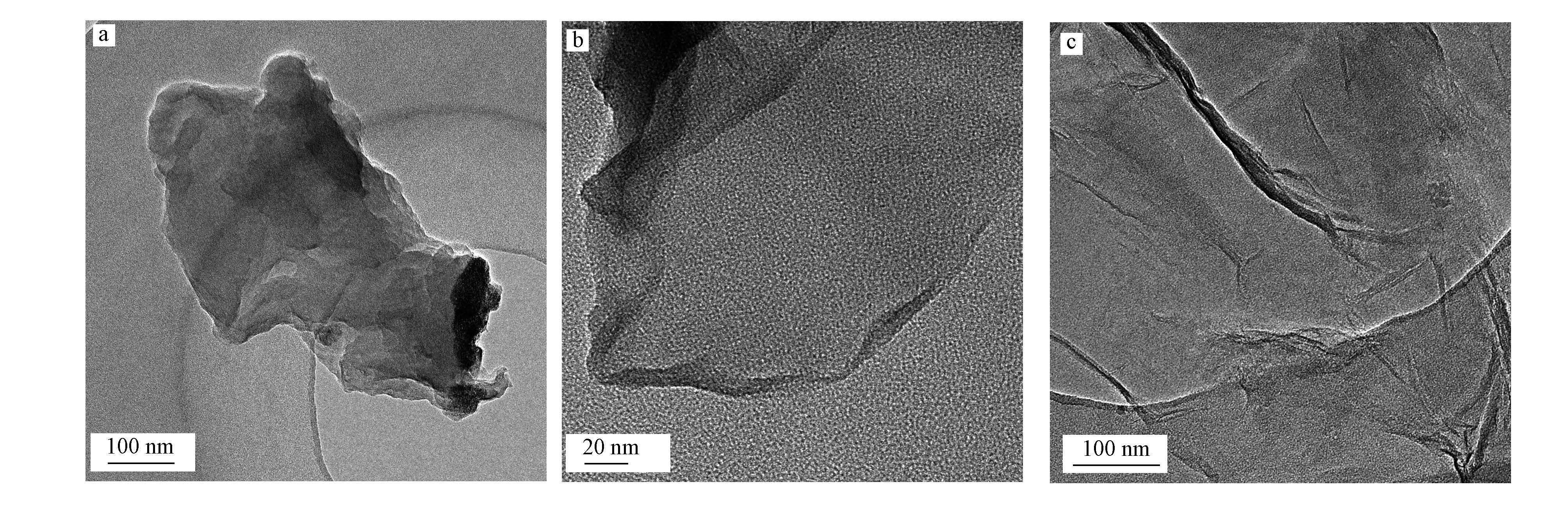 圖 2為CS、GC和GEC的透射電鏡(TEM)圖,可以看出,CS(圖 2a)的TEM圖與GC(圖 2b)和GEC(圖 2c)的TEM圖明顯不同,對比在相同放大倍數下的CS結構(圖 2a)與GEC結構(圖 2c),不難看出復合后的材料具有更好的形貌結構,進一步說明GO的引入明顯地改善了CS的形態結構.