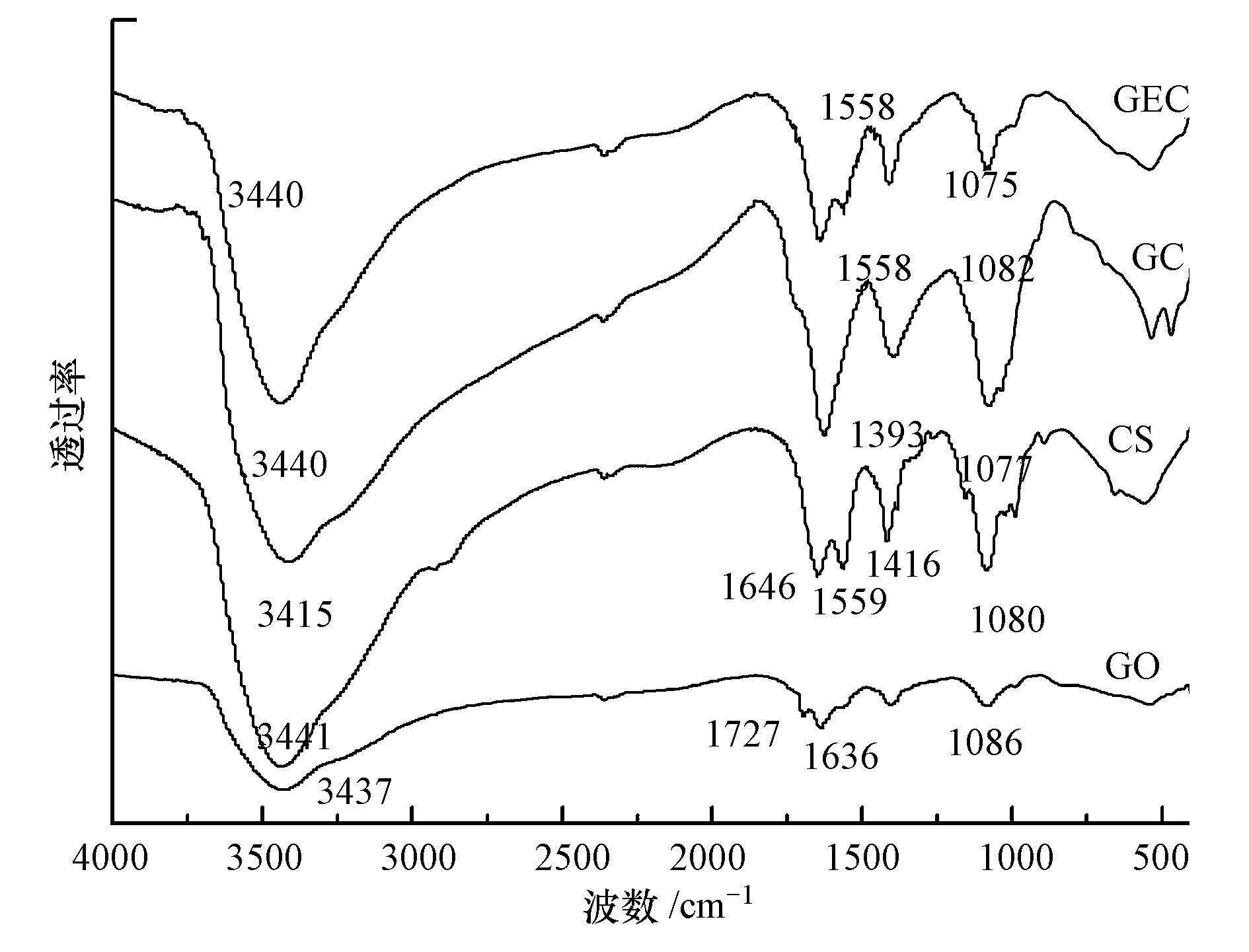 圖 4為GO、CS、GC、GEC的紅外光譜圖.從圖中可以看出,在3437、1636、1727和1086 cm-1處出現GO的O—H伸縮振動峰、C=C骨架振動吸收峰、C=O伸縮振動吸收峰和C—O伸縮振動峰.在3441、1646、1559、1416和1086 cm-1處出現CS的N—H伸縮振動峰、—NHCO—官能團上C=O伸縮振動峰、—NH2的N—H吸收峰、C—H 吸收峰和C—O振動收縮吸收峰(Wang et al.,2009;Sutar et al.,2012).從圖中還可以看出,GC的紅外圖譜中,1727 cm-1處COOH的特征峰和1559 cm-1處的—NH2特征峰不見了,在1393 cm-1處出現了新的吸收峰,表明GO的羧基和CS的氨基通過共價鍵結合,同時3440 cm-1處—OH吸收峰發生偏移,表明GO的羥基和CS的羥基之間產生氫鍵作用.而GEC的紅外圖譜顯示,在1559 cm-1處的—NH2特征峰重新出現,這是由于EDTA-2Na的加入使氨基增多,而3440 cm-1處—OH吸收峰并無明顯偏移,這是由于EDTA-2Na的部分羧基與CS的氨基反應,從而使CS與GO之間的氫鍵作用減弱.