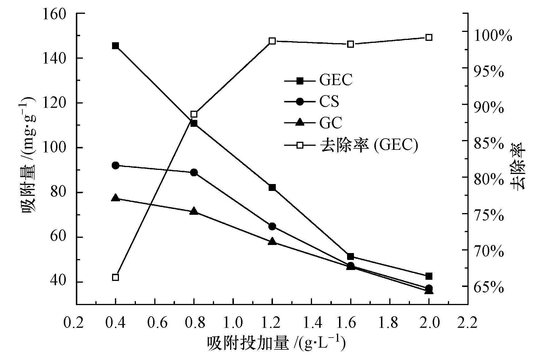 圖 7為吸附劑投加量對CR吸附效果的影響.從圖 7可以看出,GEC、GC、CS三者對CR的吸附量隨著投加量的增加逐漸降低,這是因為當溶液體積和CR初始濃度一定時,隨著吸附劑投加量增加,吸附劑上未被利用的活性位點增加,從而導致單位質量吸附劑的吸附容量降低(方巧等,2014).同時,在相同投加量情況下,GEC的吸附量比GC和CS的吸附量都要高.同時,從圖 7中還可以看出,隨著GEC投加量由0.4 g·L-1增加到2 g·L-1,CR的去除率逐漸增加,由剛開始的65%增加到接近100%.這是由于隨著GEC投加量的增加,可提供的比表面積和吸附位點也在增加(Ren et al.,2013).結合吸附量和去除率的變化,從實際應用角度出發,可選擇GEC的最佳投加量為1 g·L-1.