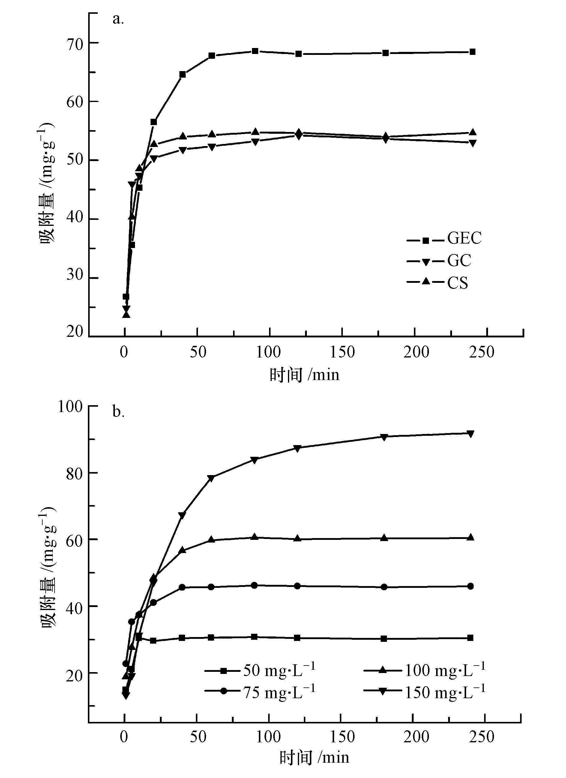 圖 8 反應時間對GEC、GC和CS吸附剛果紅的影響(a)及不同初始濃度下反應時間對GEC吸附剛果紅的影響(b)
