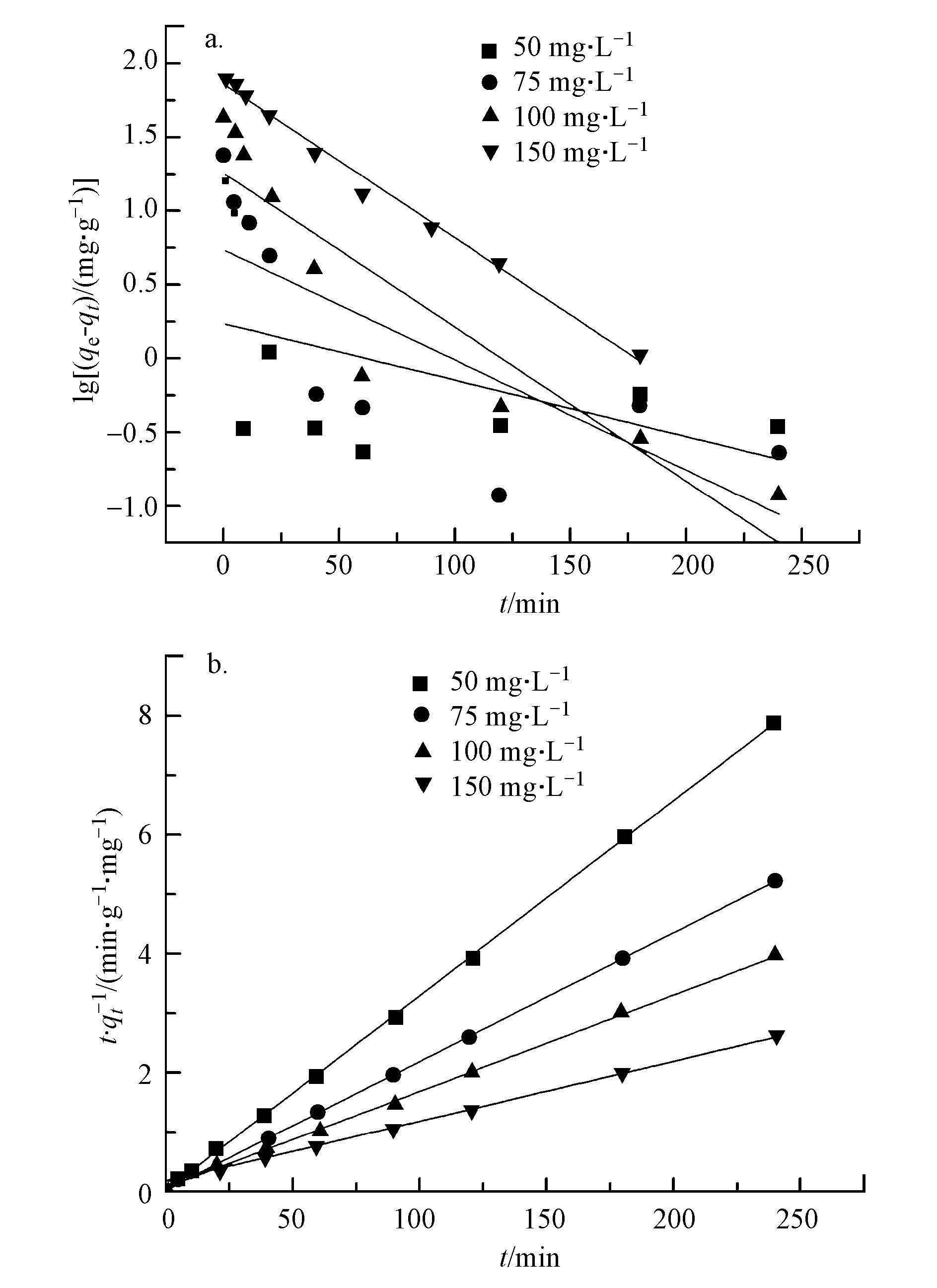 圖 9 GEC對剛果紅吸附過程的偽一級動力學(a)和偽二級動力學(b)擬合