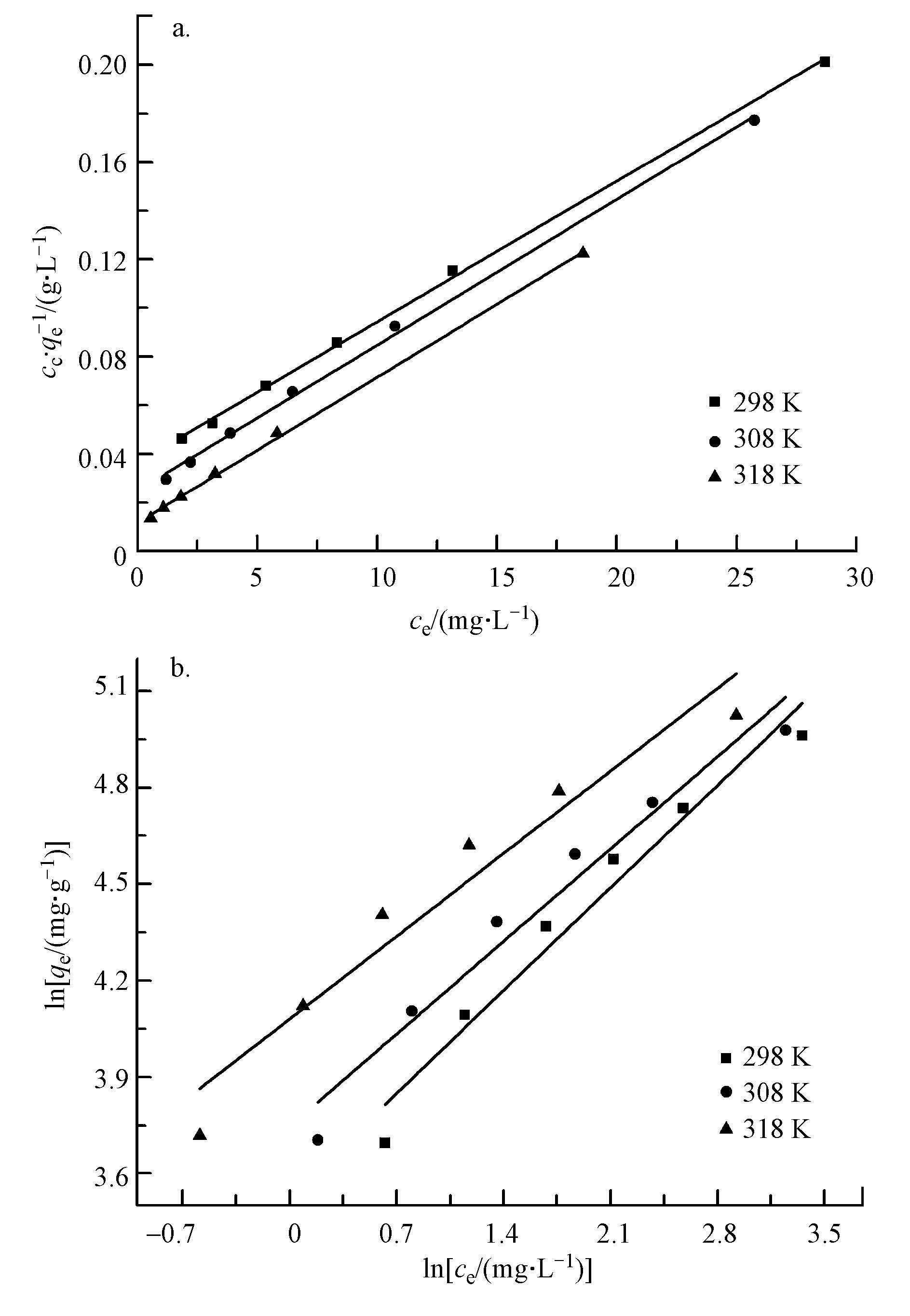 吸附等溫線研究:稱取若干份適量的GEC于裝有25 mL不同初始濃度的CR溶液的碘量瓶中,分別在298 、308 、318 K這3個不同溫度條件下以180 r·min-1的速度振蕩平衡時長后取出,經0.45 μm濾膜過濾,用分光光度法(λ=499nm)測定CR溶液剩余濃度.其中,CR在吸附劑上的吸附量通過式(1)計算.
