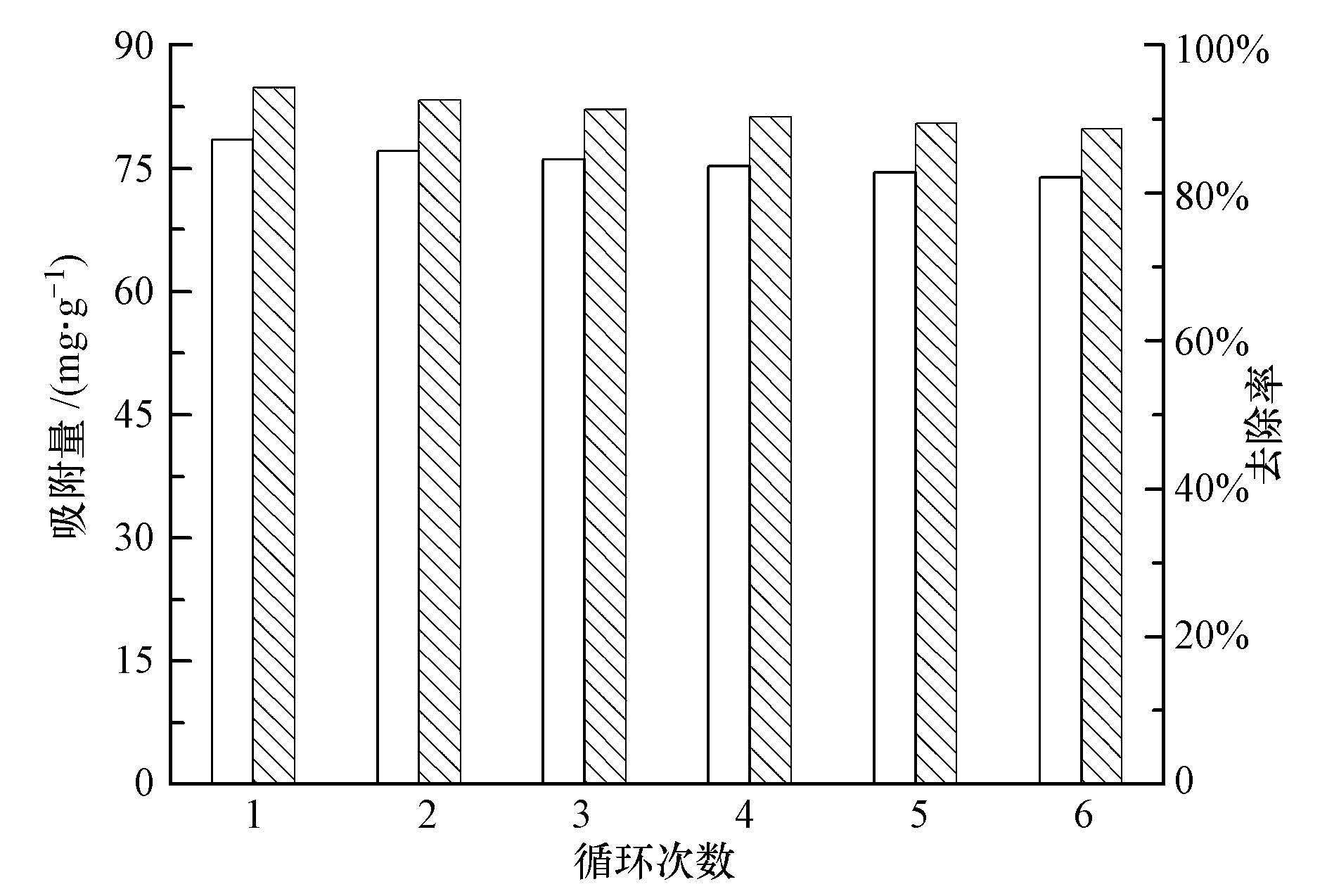 往裝有吸附飽和的吸附劑的碘量瓶中加入25 mL 2 mol·L-1的NaOH溶液,在60 ℃水浴條件下振蕩120 min后取出,靜置,脫附完后采用離心洗滌的方法用去離子水將吸附劑洗至中性,在60 ℃下干燥至恒重并經研磨、過篩后用于下一輪吸附-脫附實驗.