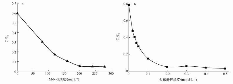 在分析M-N-G加入量對降解效率的影響后, 分析了氧化劑過硫酸鉀用量的影響.從圖 8b可以看出, M-N-G具備一定的吸附能力, 吸附去除率約為20%.因為M-N-G的比表面積為94.35 m2·g-1(BET分析結(jié)果), 可以通過表面吸附去除溶液中的亞甲基藍, 并且石墨烯上面的π鍵也可和亞甲基藍作用進行吸附.當過硫酸鉀的濃度從0.02 mmol·L-1增加到0.5 mmol·L-1時, 降解效率從50%增加到了95%, 并且從0.2 mmol·L-1到0.5 mmol·L-1, 降解效率都在90%以上, 變化不大.這些說明, 過硫酸鉀經(jīng)過活化后, 形成自由基, 降解亞甲藍的能力顯著提高.而當過硫酸鉀濃度增大到一定程度的時候, 繼續(xù)加大用量, 效果微小, 這是因為體系中的M-N-G的量是一定的, 只能有效活化一定量的過硫酸鉀, 并且隨著反應(yīng)的進行, 中間產(chǎn)物的生成, 活化位點的部分失活等因素, 也會導(dǎo)致活化劑的活性降低.盡管已有研究表明過硫酸鹽可以作為淬滅劑與硫酸根自由基反應(yīng)(Anipsitakis et al., 2003), 但在圖 8b所示的結(jié)果中, 并沒有顯著發(fā)生.其可能原因是:發(fā)生自身漼滅反應(yīng)的速度比氧化降解亞甲基藍的速度小;并且M-N-G具備一定的吸附亞甲基藍的溶液, 而催化形成硫酸根自由基優(yōu)先分布在M-N-G的周圍, 利于硫酸根自由基和亞甲基藍快速相互作用, 因此在本體系中, 較多的過硫酸鉀并沒有對體系產(chǎn)生抑制作用.