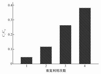 M-N-G作為催化劑, 其重復(fù)利用次數(shù)對材料的綜合性能評價至關(guān)重要.使用后的活化劑, 在外部磁場的作用下, 從體系中分離出來, 然后采用0.1 mol·L-1 H2SO4清洗后, 再用超純水清洗, 重復(fù)利用4次的結(jié)果如圖 12所示.