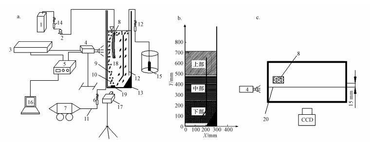 圖 1 四邊形折流式膜生物流化床實驗測試系統(tǒng)流程圖(a)、拍攝分區(qū)(b)和激光斷面分布圖(c) (1.出水箱, 2.蠕動泵, 3.激光電源, 4.激光器, 5.同步器, 6.氣體流量計, 7.空氣壓縮機, 8.膜組件, 9.氣泡, 10.椰殼活性炭, 11.進氣管, 12.進水管, 13.導流錐, 14.液體流量計, 15.潛水泵, 16.計算機, 17.相機, 18.四邊形流折流式膜生物流化床, 19.曝氣頭, 20.激光斷面)