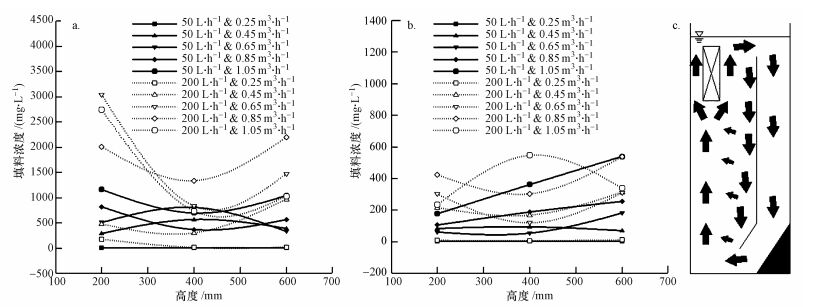 圖 2給出了流化床填料濃度的變化曲線.從圖 2a可以看出, 進水流量為50 L·h-1時, 升流區(qū)填料濃度隨曝氣強度的增加而增長.進水流量為200 L·h-1時, 填料濃度隨曝氣強度的增加呈先上升后下降趨勢.升流區(qū)在相同曝氣強度的工況下, 填料濃度隨進水流量的增加呈增加趨勢.從圖 2b可以看出, 進水流量為50 L·h-1時, 降流區(qū)填料濃度隨曝氣強度的增加而增長, 曝氣強度為1.05 m3·h-1時, 降流區(qū)填料濃度達到峰值;曝氣強度分別為0.25、0.65、0.85和1.05 m3·h-1時, 填料濃度隨流化床高度的降低而下降.進水流量為200 L·h-1時, 降流區(qū)填料濃度隨曝氣強度的增加呈先上升后下降趨勢;曝氣強度分別為0.25、0.45、0.65和0.85 m3·h-1時, 填料濃度隨流化床高度的降低呈先下降后上升趨勢.降流區(qū)在相同曝氣強度的工況下, 流化床填料濃度隨進水流量的增加呈增加趨勢.