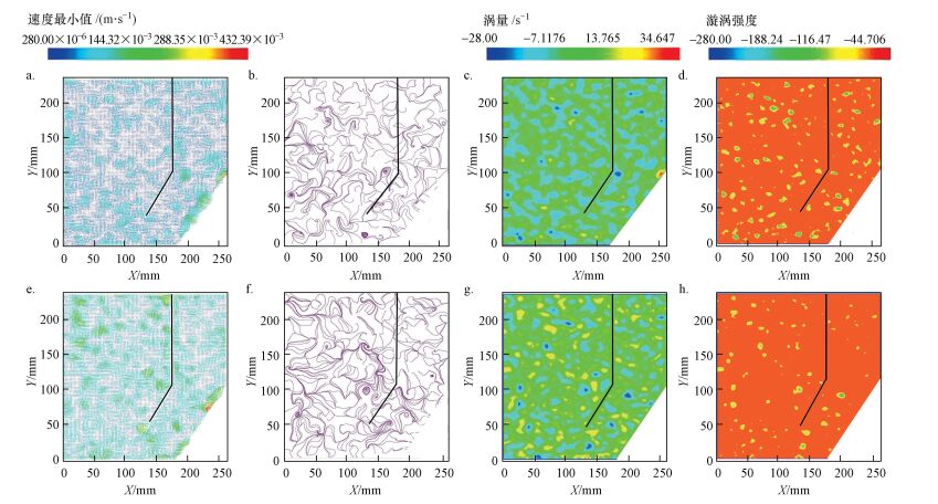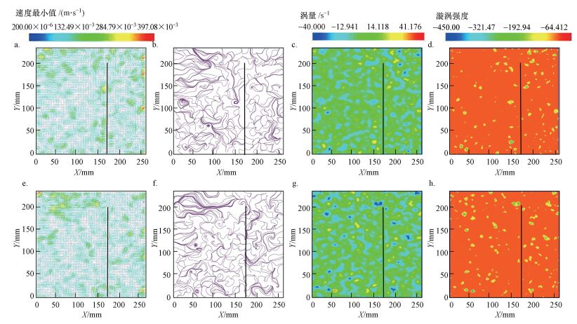 曝氣強度和進水流量為0.65 m3·h-1、200 L·h-1工況的液相流動特征從圖 6e~h可知:該工況下, 峰值速度出現(xiàn)在上部區(qū)域上部和右邊壁區(qū)域, 且高速區(qū)域面積較小;低速區(qū)分布較廣, 且低速區(qū)面積較大.升流區(qū)流線呈向右傾斜, 并出現(xiàn)多個小渦旋結(jié)構(gòu), 降流區(qū)流線較紊亂.渦量正值區(qū)域面積和負值區(qū)域面積較接近, 且呈正負交織的狀態(tài).