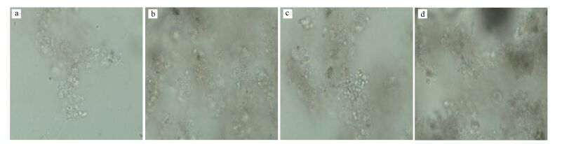 圖 5 各階段活性污泥鏡檢圖 (10 × 40光學顯微鏡)(a.未強化, b.強化5 d, c.強化30 d, d.強化40 d)