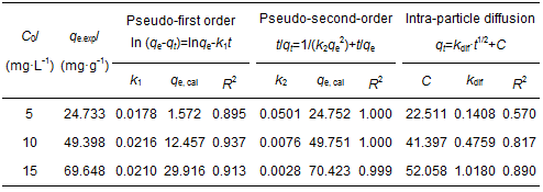 為了探討擴散速率與速率控制步驟對CS/GO吸附過程的影響, 分別采用準一級、準二級動力學模型和顆粒內擴散模型對試驗數據進行擬合, 結果如表 1所示.由表 1可知, 準二級動力學模型中3個濃度的可決系數R2均大于0.999, 且理論平衡吸附量qe, cal接近實際值qe, exp, 說明準二級動力學模型更適合描述CS/GO對U (Ⅵ) 的吸附過程, 由此表明該吸附為化學吸附, U (Ⅵ) 主要通過化學鍵合作用結合在CS/GO表面 (季雪琴等, 2016).另外, 顆粒內擴散模型的擬合直線不經過原點, 表明顆粒內擴散不是CS/GO吸附U (Ⅵ) 的速率控制步驟.