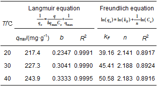 從圖 5可以看出, 隨著平衡濃度的升高, CS/GO對U (Ⅵ) 的吸附量也逐漸增加, 且吸附效果與溫度正相關.采用Langmuir和Freundlich等溫吸附方程對吸附過程進行擬合, 結果如表 2所示.由表 2可知, Langmuir等溫吸附方程的可決系數R2均大于0.999, 而Freundlich等溫吸附方程擬合度較低, 說明CS/GO對U (Ⅵ) 的吸附是單分子層吸附;Freundlich方程中的參數n均大于2, 表明吸附較易 (李凱斌等, 2014);在Langmuir等溫吸附方程中, 初始濃度為10 mg·L-1的鈾溶液在3個溫度下的分離因子RL(表 2 U (Ⅵ) 的等溫吸附方程和擬合參數