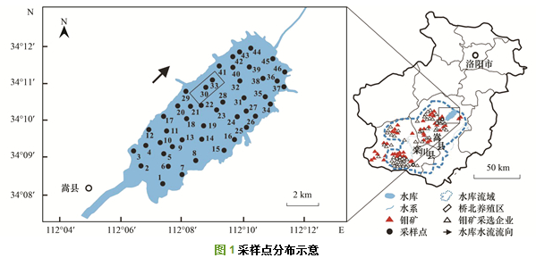 陸渾水庫是河南省洛陽市重要的飲用水源地, 毗鄰洛陽市嵩縣和欒川縣鉬礦.近年來, 我國(guó)鉬污染事件頻發(fā), 如葫蘆島水庫鉬污染(2004年8月)、洛陽市伊河鉬污染(2017年2月)等. Mo雖為人體必須的微量元素, 但人體中Mo過量會(huì)導(dǎo)致痛風(fēng)癥、貧血、腹瀉等.作為當(dāng)?shù)刂匾娘嬘盟春凸まr(nóng)業(yè)生產(chǎn)水源, 陸渾水庫自建庫以來發(fā)揮了巨大的社會(huì)效益和經(jīng)濟(jì)效益, 庫區(qū)水環(huán)境安全意義重大.因此, 探明陸渾水庫飲用水源地金屬濃度分布特征, 評(píng)價(jià)潛在人體健康風(fēng)險(xiǎn)具有重要意義.