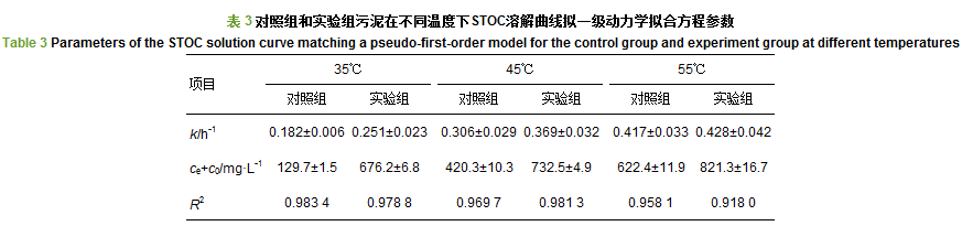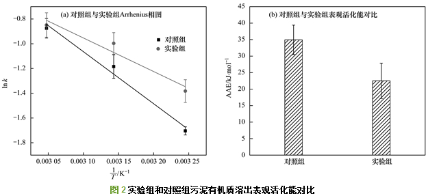 表 3表示對照組和實驗組污泥STOC溶出結果按擬一級動力學擬合后的參數. 圖 1表示不同溫度下(35、45、55℃)對照組和實驗組污泥的STOC溶出量隨時間的變化.結果可知, 在相同溫度下, 實驗組污泥的平衡STOC和溶解速率常數k均高于對照組, 說明該方法能有效提升有機質溶出量和溶出速率, 改善污泥中有機物的溶解特性; 該結果同時暗示在后續的厭氧產酸和產甲烷過程中將有更多可被微生物利用的底物, 最終提高微生物的厭氧消化潛力.隨著溫度的升高, 對照組和實驗組污泥的溶解速率常數k增加, 水解速率加快, 平衡STOC濃度增加, 說明提高溫度能提升有機質溶出量和溶出速率.此外, 隨著溫度升高, 對照組和實驗組污泥的STOC溶解曲線不斷接近; 實驗組污泥35℃時與對照組在55℃下的平衡STOC濃度接近, 表明經EDTA預處理后, 污泥中較大部分有機質已經溶出, 溫度對其有機質溶出量的影響較小, 實驗組污泥在較低的溫度下即可達到對照組在較高溫度下的溶出效果. 圖 2為對照組和實驗組污泥的Arrhenius相圖和有機質溶出的表觀活化能對比.從圖 2(a)可知, 在相同溫度下, 對照組的溶解速率常數k小于實驗組. 圖 2(b)為對照組和實驗組污泥的AAE值.實驗組污泥的有機質溶出表觀活化能低于對照組, 下降率為36%, 結果表明, 經EDTA預處理后, 污泥有機質溶出的能量壁壘降低, 污泥有機質的溶出能力提高, 有利于緩解污泥厭氧消化過程水解階段限速的影響.