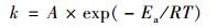 式中, k為溶解速率常數, h-1; A為指前因子; R為摩爾氣體常數, J·(mol·K)-1; T為熱力學溫度, K; Ea為污泥有機質溶出表觀活化能, kJ·mol-1.