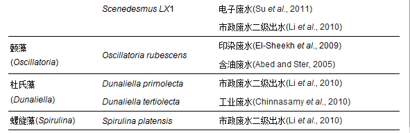 污水中存在大量的細(xì)菌群落,菌藻之間的相互作用關(guān)系復(fù)雜,因此如何利用菌藻之間的互利共生關(guān)系較好的構(gòu)建菌藻系統(tǒng)是將其系統(tǒng)應(yīng)用于污水處理的前提之一.目前,微藻在污水處理中的應(yīng)用主要有兩個(gè)目的:其一是利用微藻來凈化污水,去除污染物,節(jié)約能源,此時(shí),選擇微藻應(yīng)綜合考慮微藻對(duì)污水中可能存在的污染物(如高氨氮、重金屬離子、毒性化合物等)的耐受能力,從高氧氣產(chǎn)生速率,高二氧化碳捕獲能力,強(qiáng)勁的生長(zhǎng)特性方面選擇微藻來提高其對(duì)環(huán)境變化的耐受力;此外,可用污水來培養(yǎng)微藻,收獲的微藻作為生物質(zhì)能源解決能源危機(jī),減少微藻培養(yǎng)過程中的物質(zhì)(N、P和水等)消耗,考慮選擇的微藻應(yīng)有較高的生長(zhǎng)速率,高的油脂含量和產(chǎn)率,以便后續(xù)收獲微藻作為生物質(zhì)能源.針對(duì)不同的生活污水和工業(yè)廢水,表 1列舉了污水處理中常用的微藻種類.