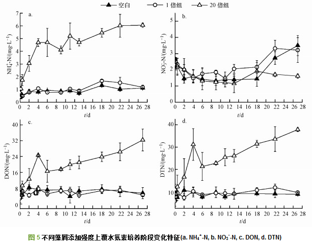 氮、磷作為限制性營養元素, 在藻類生長過程中發揮著不可或缺的作用;而作為藻類碎屑礦化分解釋放的主要產物, 也不可忽視研究表明, NH4+-N、PO43--P釋放量與藻添加濃度成正比, 藍藻分解明顯增加了水體中氮、磷濃度.這是由于溶解性有機氮(DON)與溶解性有機磷(DOP)作為藻源性DOM最為活躍的部分, 易被微生物利用轉化成為無機氮、磷營養鹽.而且藍藻積累易消耗上覆水中大量的DO, 降低硝化細菌活性, 引起上覆水中NH4+-N、PO43--P不斷積累.這時DO成為沉積物有機質礦化的主要影響因素, 制約著氮、磷釋放.Roberts等(2012)研究表明, 富含有機質的沉積物在O2削弱區域向上覆水釋放大量NH4+-N、PO43--P, 增加了沉積物有機質礦化速率.因此, 藻類碎屑有機質在沉積物中積累對沉積物氮、磷釋放的影響不容忽視.
