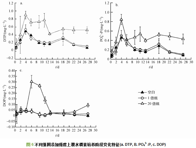 藻屑加入沉積物后PO43--P與DTP快速釋放, 上覆水中PO43--P與DTP變化趨勢相同.各實驗組PO43--P與DTP均在前4 d顯著增加, 并在第4 d到達最高值(圖 6a、6b).第4 d到達峰值后上覆水中PO43--P與DTP濃度降低, 隨時間變化無顯著差異.各個實驗組相比, 空白組與1倍組PO43--P與DTP釋放量無顯著差異(p > 0.05).20倍組PO43--P與DTP釋放程度遠高于空白組與1倍組, 其中,空白組、1倍組和20倍組PO43--P最高濃度分別為0.46、0.50和0.90 mg·L-1.空白組與1倍組DOP釋放較為平穩, 實驗期間無顯著性差異(p > 0.05)(圖 6c).20倍組DOP釋放前4 d與其他兩組無顯著性差異, 但在第4~6 d增加0.25 mg·L-1, 第6 d后逐漸降低至穩定(圖 6c).說明低密度藻屑添加條件下直接通過藻屑分解釋放的DOP較低, 主要是由沉積物礦化引起的釋放.高密度藻屑輸入在短時期內分解可促進沉積物中PO43--P與DTP釋放, 并且釋放的DTP主要以PO43--P形態釋放, 占DTP釋放比例的57.74%~93.10%.