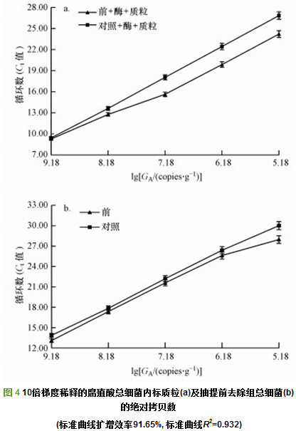 為了深入研究抽提前活性污泥腐殖酸的去除及模板濃度對(duì)定量PCR擴(kuò)增的影響, 以雜質(zhì)腐殖酸10倍梯度稀釋已知濃度的總細(xì)菌內(nèi)標(biāo)質(zhì)粒, 定量的Ct值如圖 4a所示.由圖 4a可知, 隨著目的基因拷貝數(shù)(GA)對(duì)數(shù)值的降低, 抽提前去除過(guò)腐殖酸的內(nèi)標(biāo)質(zhì)粒組Ct值逐漸低于對(duì)照組, 梯度稀釋模板1~100倍的Ct值差值增加, 梯度稀釋模板100~10000倍的Ct值基本無(wú)變化, 說(shuō)明梯度稀釋去除腐殖酸的活性污泥基因組模板100倍以上(含100倍), 可提高定量PCR的擴(kuò)增效率, 降低腐殖酸對(duì)活性污泥定量PCR的抑制效應(yīng).