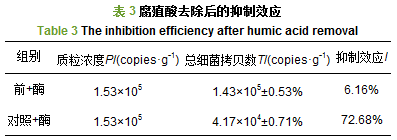 為了進(jìn)一步研究活性污泥腐殖酸的去除及活性污泥基因組模板濃度的變化對(duì)抑制效應(yīng)的影響, 表 3對(duì)腐殖酸去除后的抑制效應(yīng)進(jìn)行了調(diào)查.表 3結(jié)果顯示, 抽提前腐殖酸去除組和對(duì)照組的雜質(zhì)中加入的內(nèi)標(biāo)質(zhì)粒濃度為1.53×105 copies·g-1, 抽提前腐殖酸去除的雜質(zhì)組抑制效應(yīng)為6.16%,顯著低于對(duì)照雜質(zhì)組的72.68%(p < 0.05), 說(shuō)明抽提前去除腐殖酸降低了抑制效應(yīng), 顯著提高了活性污泥定量PCR的準(zhǔn)確性.