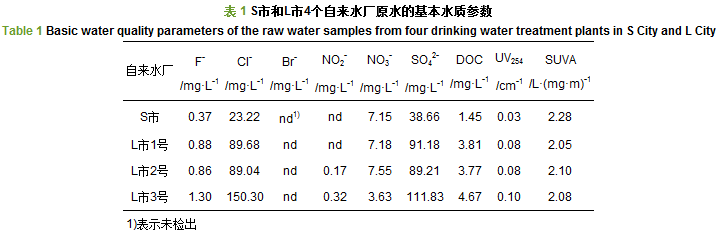 S市自來水廠(其出廠水為S-a)采用的是深度水處理工藝, 工藝流程為預(yù)氧化、混凝沉淀、過濾、臭氧、活性炭和加氯消毒, 預(yù)氧化劑為氯胺, 混凝劑為聚合硫酸鋁溶液, 氯消毒劑為次氯酸鈉, 日常投加量需保證出廠水中余氯量為0.80~1.20 mg·L-1; L市1號自來水廠(其出廠水為L-a)采用的是常規(guī)水處理工藝, 工藝流程為預(yù)氧化、混凝沉淀、過濾和加氯消毒, 預(yù)氧化工藝為預(yù)氯化, 混凝劑為聚合氧化鋁溶液, 氯消毒劑的日常投加量為3.00~4.00 mg·L-1, 保證出廠水中余氯量為0.50 mg·L-1; L市2號自來水廠(其出廠水為L-b)和3號自來水廠(其出廠水為L-c)均采用的是深度水處理工藝, 工藝流程為預(yù)氧化、混凝沉淀、過濾、臭氧、活性炭和加氯消毒, 預(yù)氧化劑為氯和臭氧, 而L市2號自來水廠和3號自來水廠所用的混凝劑、氯消毒劑以及出廠水中余氯量均與L市1號自來水廠保持一致.同時, 本研究對4個自來水廠的原水進行了采集, 所采集的水樣經(jīng)0.45 μm玻璃濾膜過濾后用于無機陰離子(F-、Cl-、Br-、NO2-、NO3-和SO42-)、溶解有機碳(DOC)和UV254分析.比紫外吸光度(SUVA)是UV254與DOC的比值, 用于表征水中有機物親疏水特性, SUVA值越小表示其水樣中親水性物質(zhì)越多[14]. 4個自來水廠原水的基本水質(zhì)參數(shù)列在表 1中.