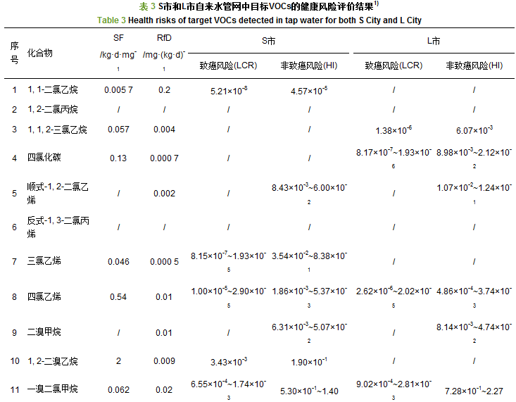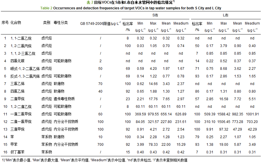 表 2 目標VOCs在S市和L市自來水管網(wǎng)中的檢出情況1) Table 2 Occurrences and detection frequencies of target VOCs in tap water samples for both S City and L City