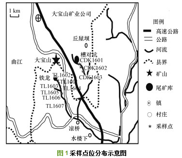 粵北大寶山礦是華南地區(qū)最大型的多金屬硫化物礦床.大寶山礦地處廣東省韶關(guān)市曲江和翁源兩縣的交界處, 流域范圍為東經(jīng)113°40′~113°43′、北緯24°30′~24°36′, 屬于亞熱帶季風(fēng)氣候區(qū), 溫暖潮濕多雨, 表層巖石風(fēng)化強烈.大寶山礦是一座大型鐵多金屬伴生礦床, 礦區(qū)主礦體上部為褐鐵礦體, 中部為銅硫礦體, 下部為鉛鋅礦體, 并伴生有鎢、鉍、鉬、金和銀等有色金屬礦和多種微量毒害元素(As、Hg、Cd、Ga、In、Tl、Se、Te、Mn、Sb、Sn等).礦山開發(fā)后, 含有銅、鉛、錳、鉻等數(shù)種重金屬超標(biāo)的污水曾經(jīng)被排放到橫石河水中.含有超量金屬元素的污水長期灌溉農(nóng)田, 造成土質(zhì)被破壞, 農(nóng)作物產(chǎn)量逐年下降, 而且威脅附近村民的健康.因此本文選取對人體健康危害較大的Pb、Cu、Mn、Cr 4種重金屬進(jìn)行研究.