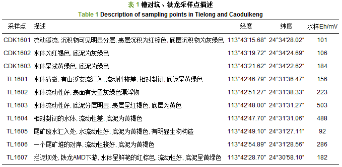 研究區(qū)包括槽對坑、鐵龍尾礦庫內(nèi)及尾礦庫酸性廢水影響的下游流域(圖 1), 共設(shè)計采樣點10個, 分別為有3個槽對坑采樣點、7個鐵龍采樣點(表 1).2016年3月對研究區(qū)樣品進(jìn)行一次性集中采集.水樣在野外采集時即對其測定pH、Eh值, 用注射器吸取水樣裝進(jìn)聚乙烯塑料瓶帶回實驗室.表層沉積物樣品是取表層約0.5 cm厚的沉積物, 裝于樣品袋帶回實驗室.