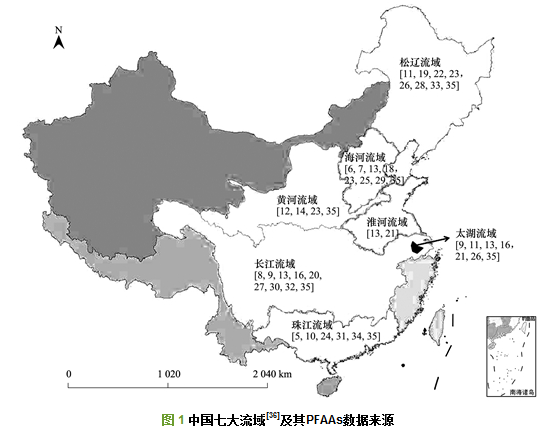 全氟烷基酸作為加工助劑和表面活性劑被廣泛應用的同時, 所引起的生態污染及對人體健康的潛在威脅也受到了高度關注.有研究表明, 水體是PFAAs進入環境的直接受體.中國河網密布、湖泊眾多, 根據主要河流覆蓋區域可劃分為松遼、海河、黃河、淮河、太湖、長江和珠江七大流域.各流域PFAAs污染程度與區域經濟發展、自然地理特征等因素密切相關.動物實驗已經證實全氟辛烷磺酸和全氟辛酸具有神經毒性、生殖毒性和免疫毒性, 飲水暴露PFAAs的健康風險評價勢在必行.因此, 明確中國水資源污染現狀, 是評估國民飲水暴露PFAAs健康風險的重要基礎.