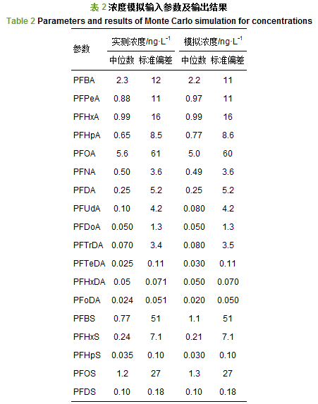 運用蒙特卡羅算法, 模擬次數為10 000次, 分別獲得七大流域18種PFAAs的模擬濃度和中等暴露水平下成人的ADD模擬值.濃度模擬的輸入參數包括七大流域18種PFAAs濃度中位數及其標準偏差(表 2); ADD模擬的輸入參數包括七大流域18種PFAAs模擬濃度中位數及其標準偏差(表 2)、日均飲水攝入量(中位數:1.9 L·d-1, 標準偏差:0.17)及體重(中位數:61 kg, 標準偏差:3.4).風險評估結果的可靠性通過比對模擬值與計算值, 進行不確定度分析.